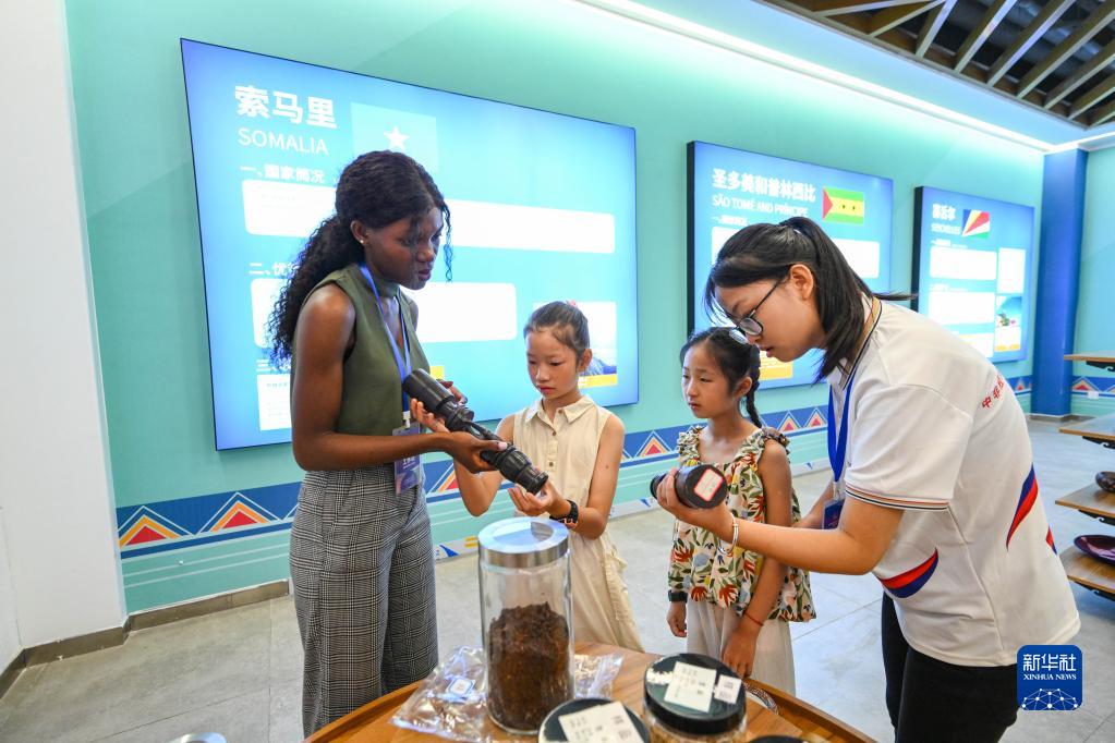6月30日,在中非經貿合作促進創新示范園(湖南高橋大市場),來自赤道幾內亞的志愿者喜樂(左一)和來自湖南信息學院的志愿者袁哲(右一)給前來參觀的小朋友講解展品。