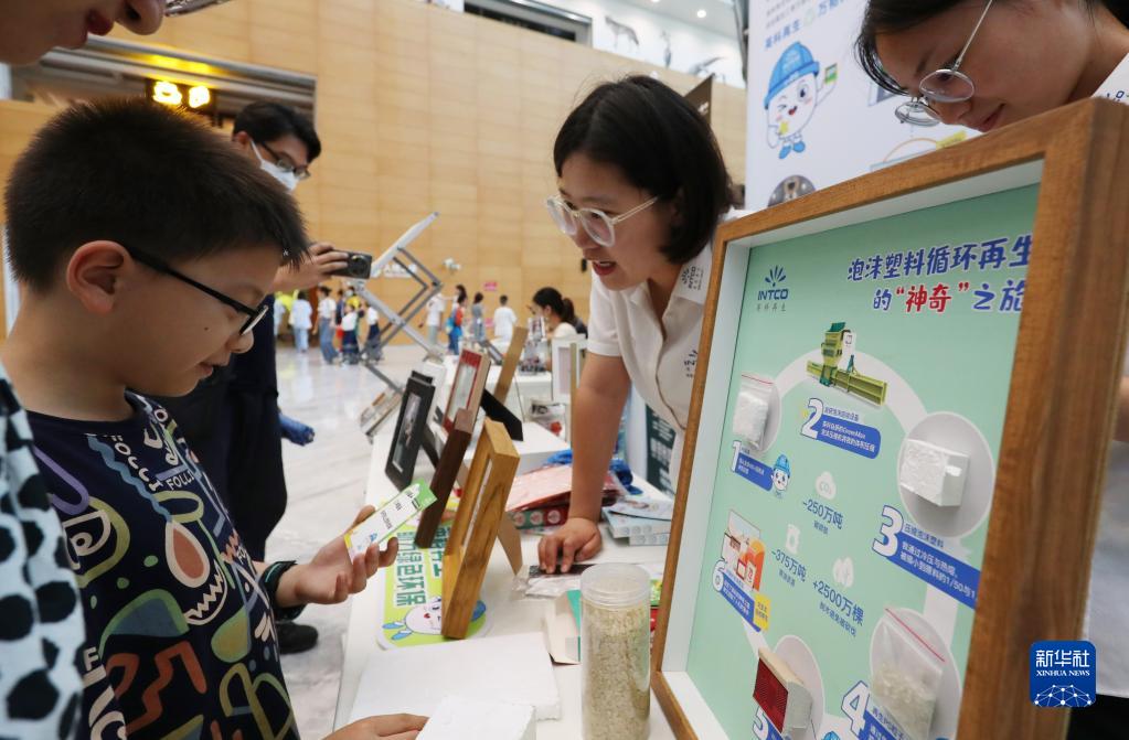 6月30日,工作人員(中)在上海自然博物館內舉行的“科創教育集市”上與小朋友交流關于泡沫塑料循環利用的知識。