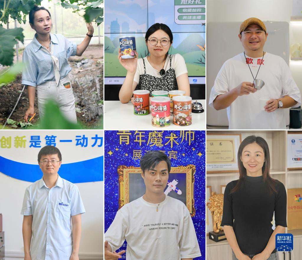 拼版照片:上左圖為6月30日,杜涔誠在如東虹橋家庭農場葡萄園內勞作(新華社記者 季春鵬 攝);上中圖為6月29日,冒吳娜在如東電商公服中心展示直播帶貨的產品(新華社記者 季春鵬 攝);上右圖為6月30日在如東無名之輩咖啡店拍攝的店主陳維華(新華社記者 柳文惠 攝);下左圖為6月27日,在如東江蘇海寶新能源有限公司拍攝的公司技術部部長楊海濤(新華社發 許叢軍 攝);下中圖為6月30日拍攝的如東縣少年雜技團魔術師朱明珠(新華社發 許叢軍 攝);下右圖為6月30日拍攝的如東縣少年雜技團魔術師丁洋(新華社發 許叢軍 攝)。