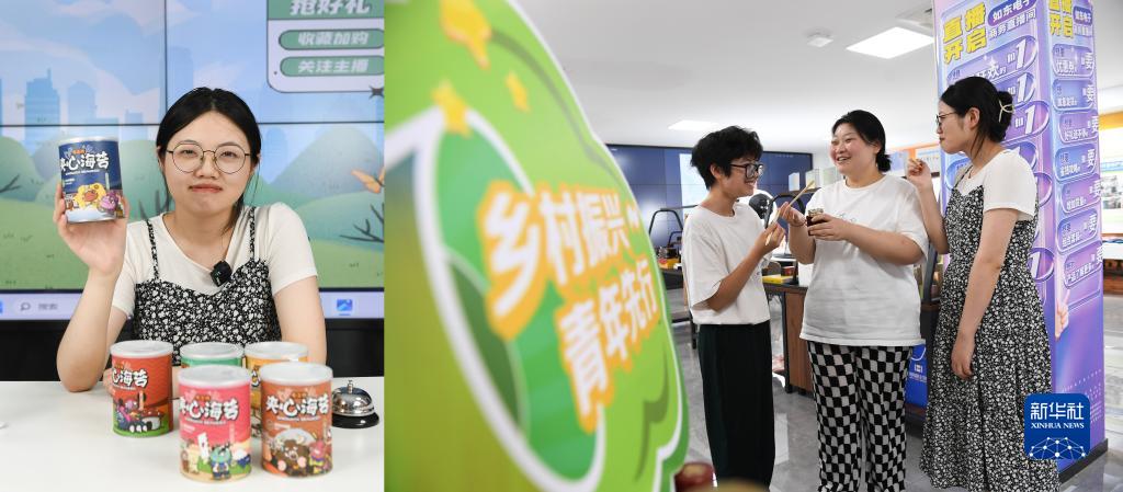 拼版照片:左圖為6月29日,冒吳娜在如東電商公服中心展示直播帶貨的產品;右圖為6月29日,在如東電商公服中心,冒吳娜和“00后”同事們品嘗準備直播的產品。
