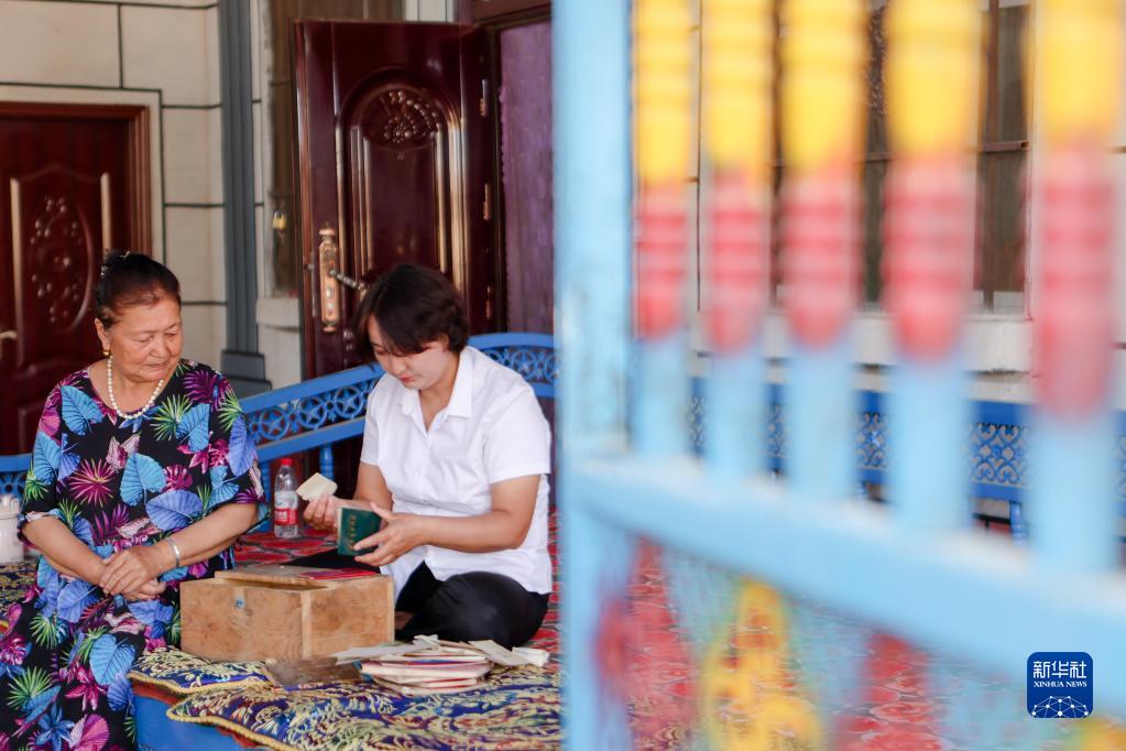 6月26日,古麗拜克熱·買明(右)和母親在家中整理爺爺留下的工作筆記等資料。
