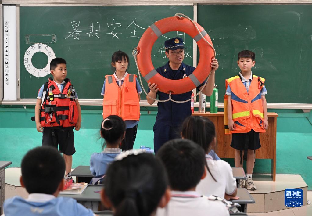 6月30日,消防救援人員在河北省石家莊市平山縣西柏坡希望小學為孩子們講解防溺水知識。