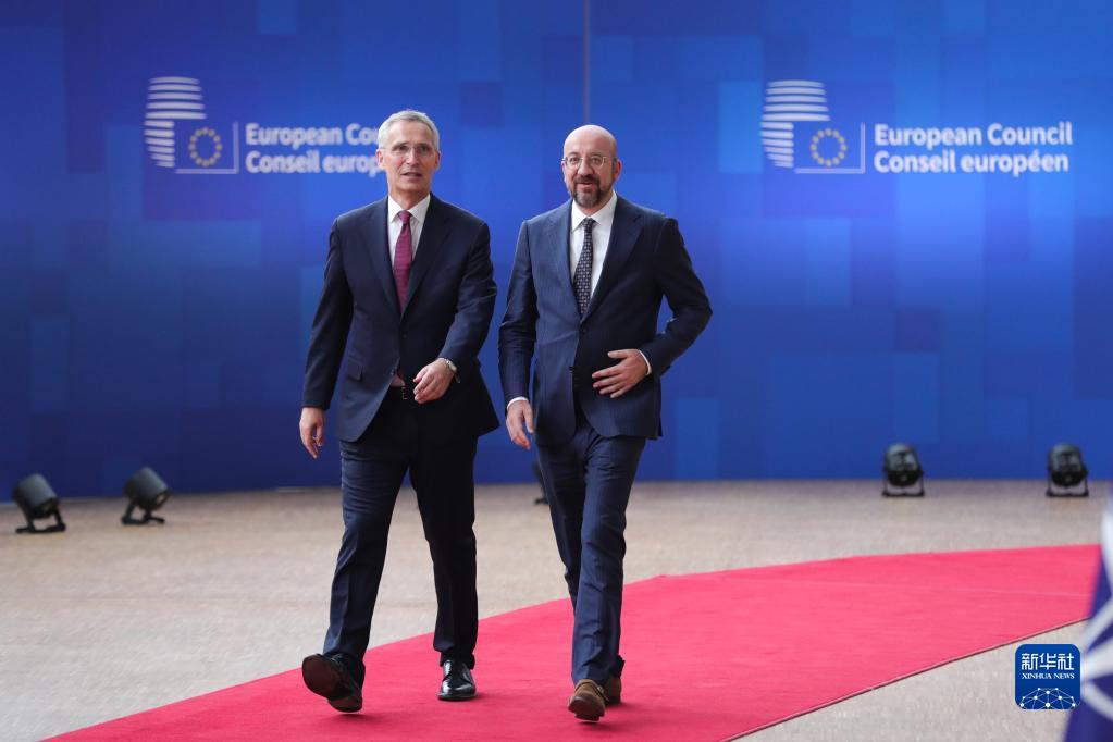 6月29日,在比利時布魯塞爾,歐洲理事會主席米歇爾(右)與北約秘書長斯托爾滕貝格抵達歐盟總部準備出席歐盟峰會。