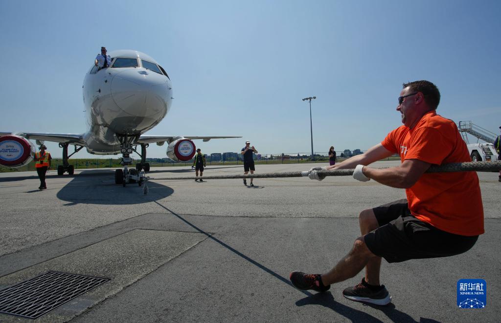 6月25日,在加拿大溫哥華國際機場,一名男子努力拉動飛機。