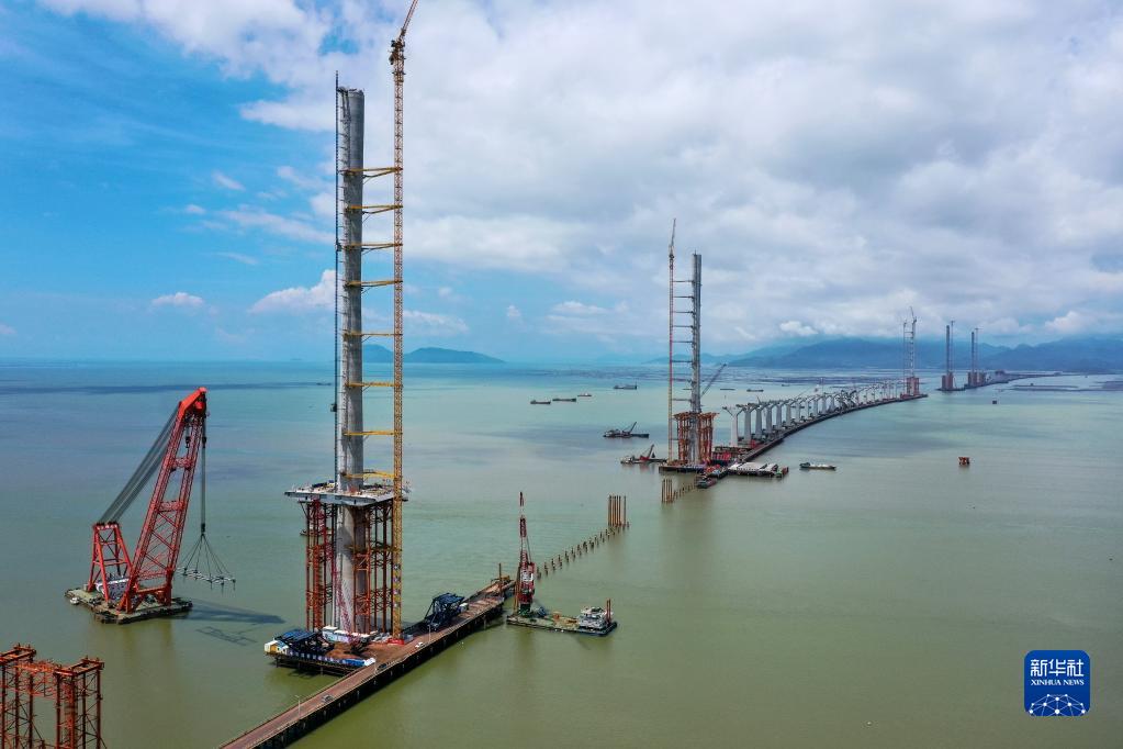 中交路建承建的黃茅??绾Mǖ栏邫诟鄞髽驏|主塔(左一)在海中5座主塔當中率先架設首榀鋼箱梁(6月29日攝,無人機照片)。