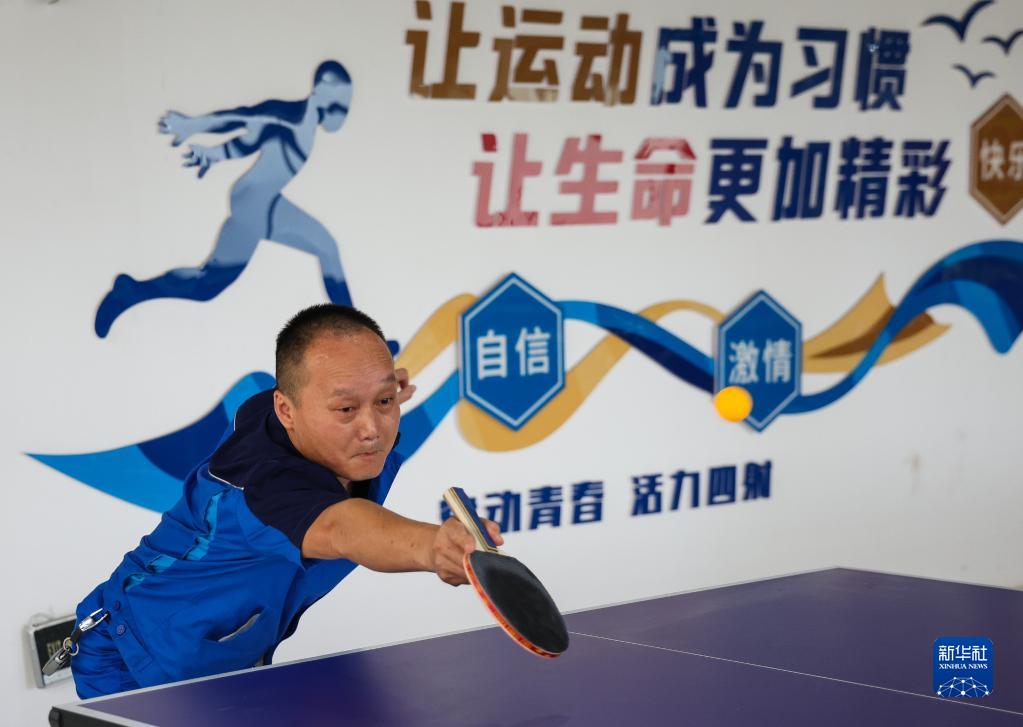 中交路建黃茅??绾Mǖ理椖坎繂T工在文體活動室打乒乓球(6月29日攝)。