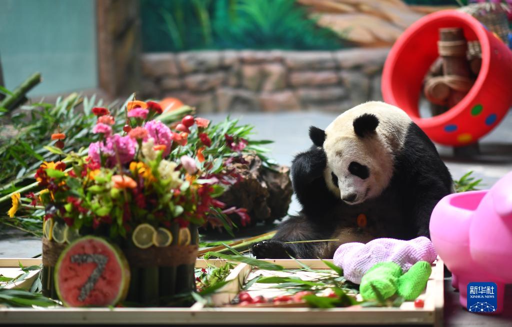 7月1日,一只大熊貓在西寧熊貓館活動。