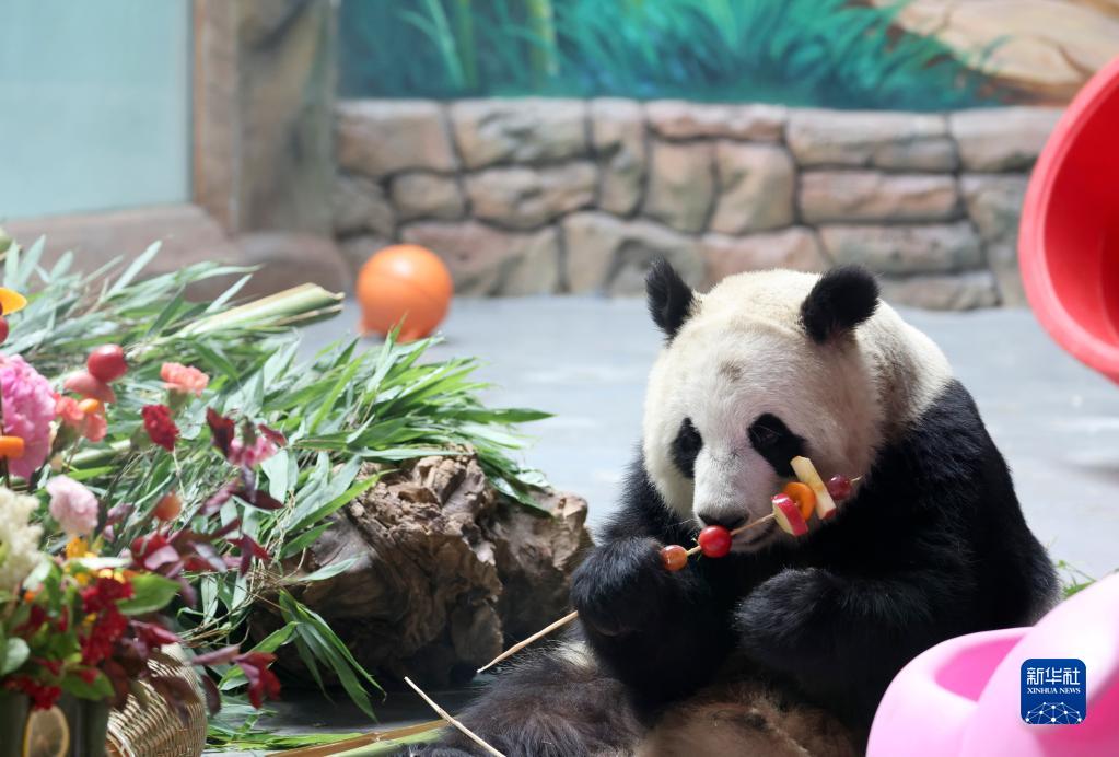 入夏以來,在位于青海省西寧市的西寧熊貓館,飼養員用胡蘿卜、蘋果、番茄、竹子等食材,為館里的4只大熊貓進行食物豐容,調整飲食結構。