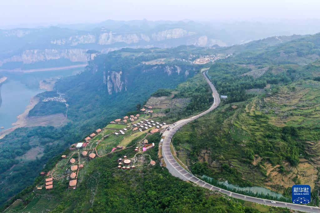 這是貴州省黔西市新仁苗族鄉化屋村沿岸的露營基地(5月30日攝,無人機照片)。