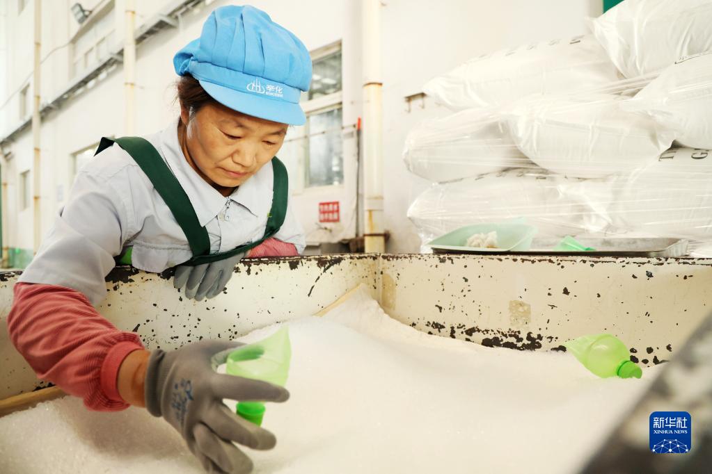 6月30日,在山東辛化硅膠有限公司,工人在挑揀硅膠顆粒中的雜質。