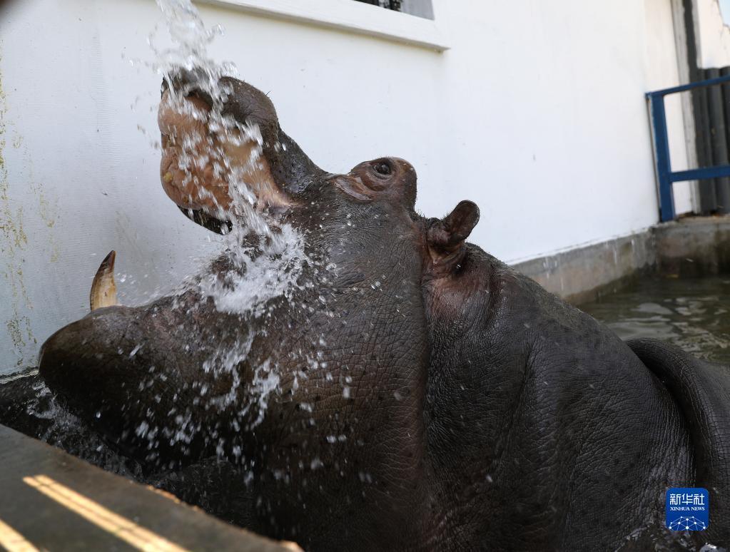 7月1日,河馬“歡歡”在鞍山市動物園里沖水納涼。