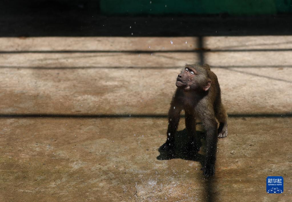 7月1日,鞍山市動物園的一只小猴享受噴水的愜意。
