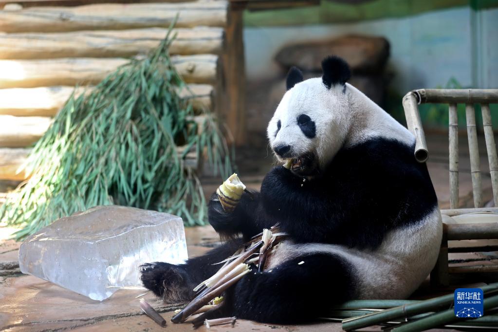 7月1日,鞍山市動物園熊貓館里的雌性熊貓“杉杉”一邊享受著空調,一邊在冰塊旁啃著竹筍。