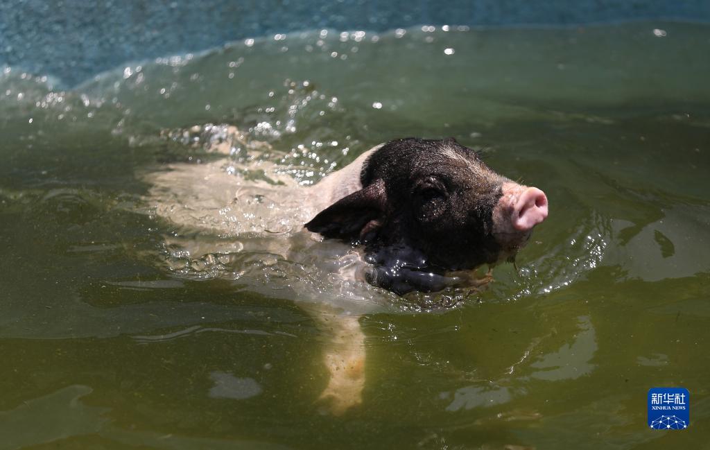 7月1日,一只小香豬在鞍山市動物園的水池里游泳避暑。