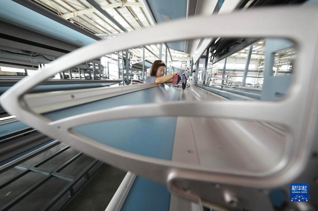 7月1日,工人在河北省唐山市豐潤區一家動車組列車配件企業的生產車間工作。