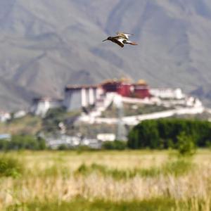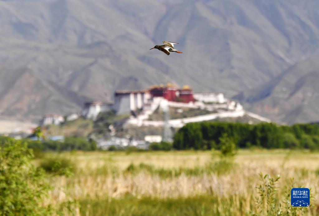 夏季,進入繁殖期的紅腳鷸在拉薩市拉魯濕地國家級自然保護區里鳴叫、翔舞。