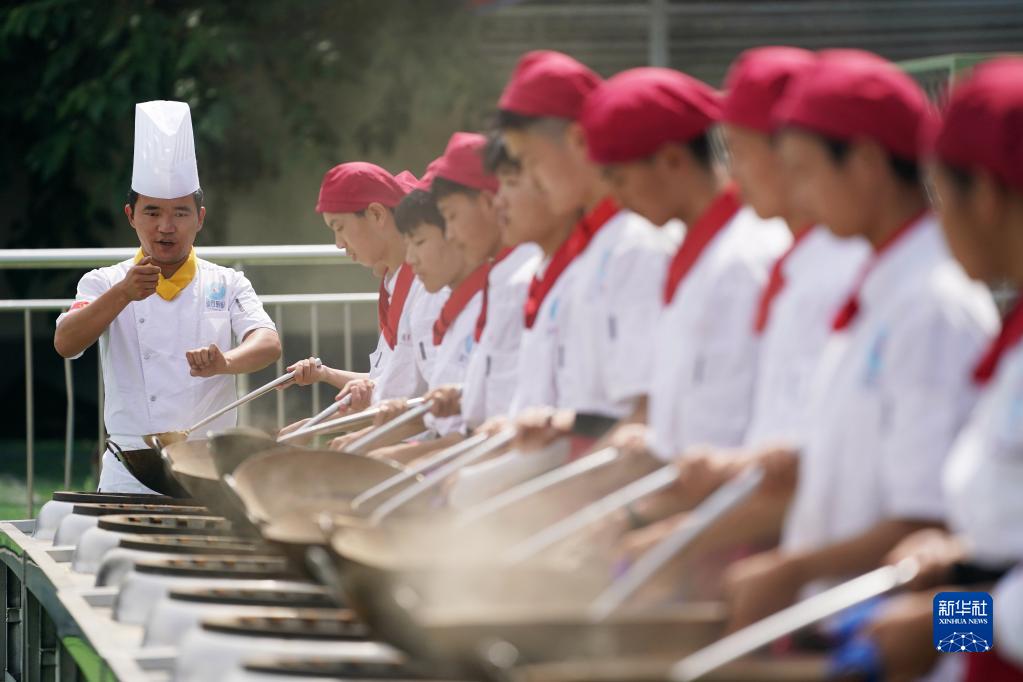6月25日,在位于西安市藍田縣的藍田廚師學校,教師成曉強(左一)指導學生們練習翻勺。