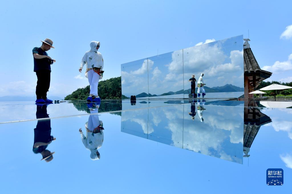 盛夏時節,在湖北省恩施土家族苗族自治州宣恩縣鑼圈巖村的一處鄉村民宿,藍天白云下的“天空之鏡”美景如畫,吸引游客打卡游玩。
