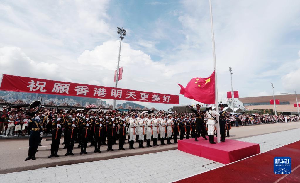 7月1日,解放軍駐港部隊昂船洲軍營舉行升國旗儀式。