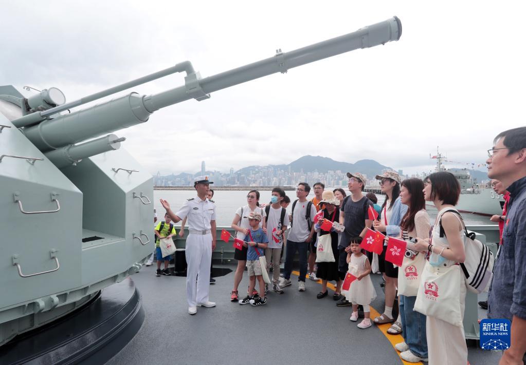 7月1日,在昂船洲軍營,解放軍官兵為參觀艦艇的香港市民講解武器裝備。