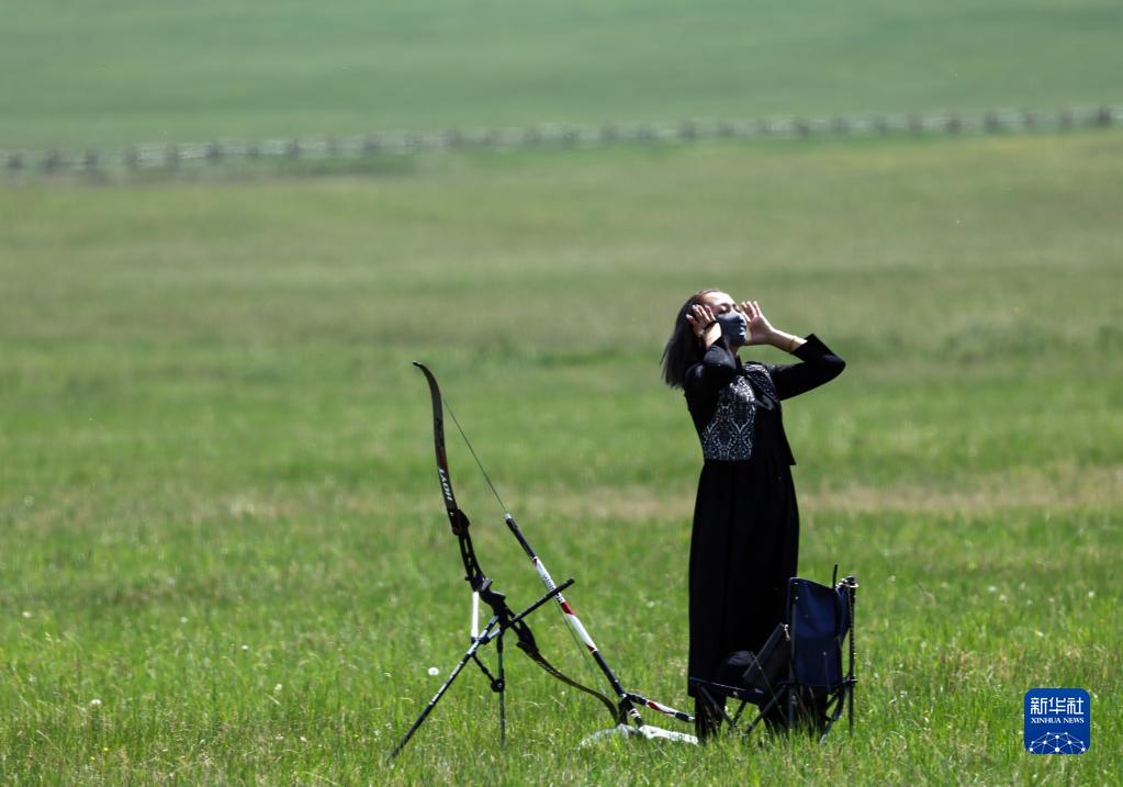 7月1日,一名參加射箭比賽的女選手在賽前整理頭發。