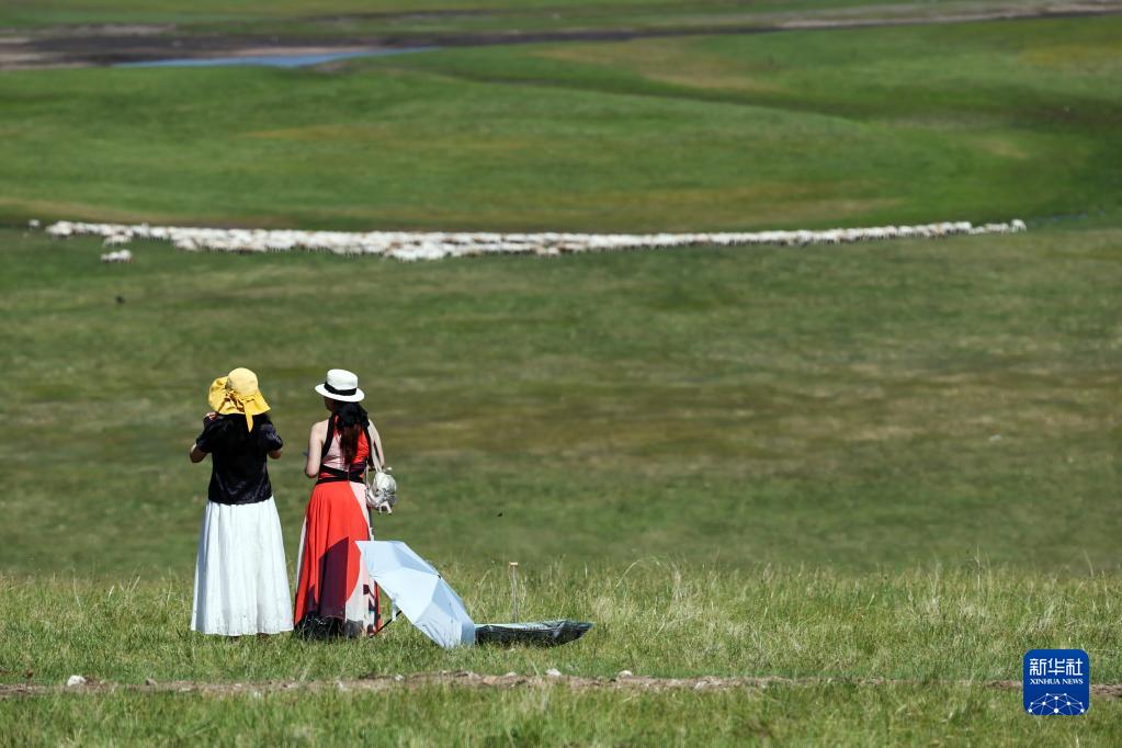 7月1日,兩名參加開幕式的觀眾在活動現場周邊眺望遠處的羊群。
