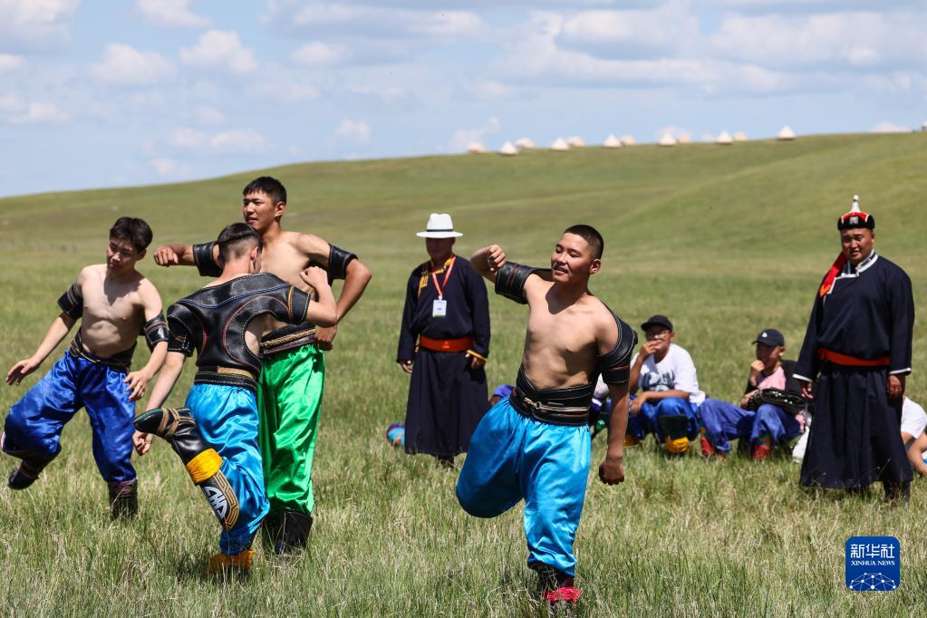 7月1日,參加搏克比賽的小選手們在上場前走“鷹步”。