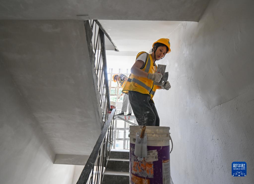 6月30日,在四川省樂山市市中區海棠街道一處老舊小區改造工地,中建安裝華西公司的工人在樓道內抹灰。