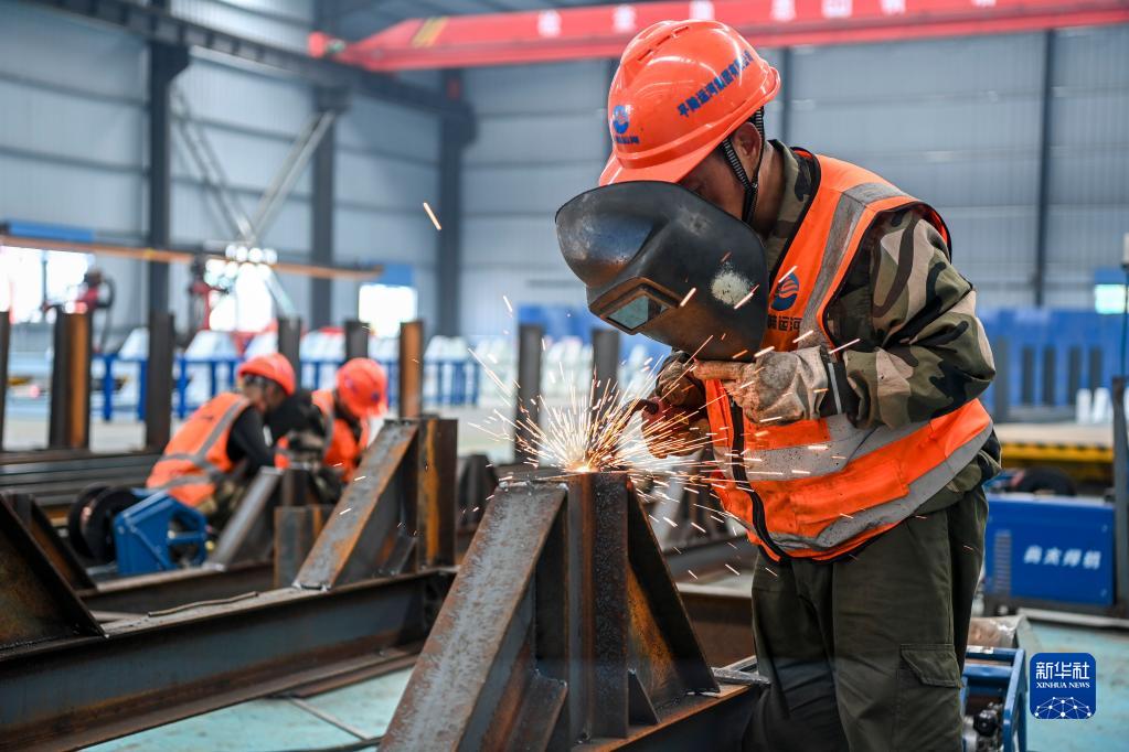 7月1日,在平陸運河馬道樞紐建設現場,工人在進行焊接作業。