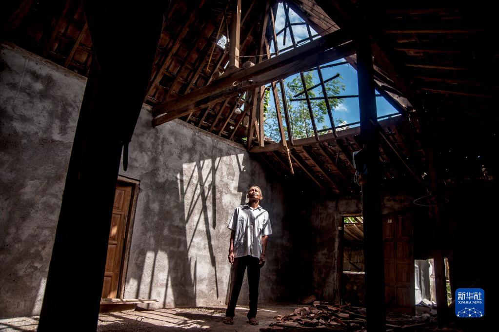 7月1日,在印度尼西亞日惹特區帕卡雷霍村,一名男子站在被地震破壞的房屋內。