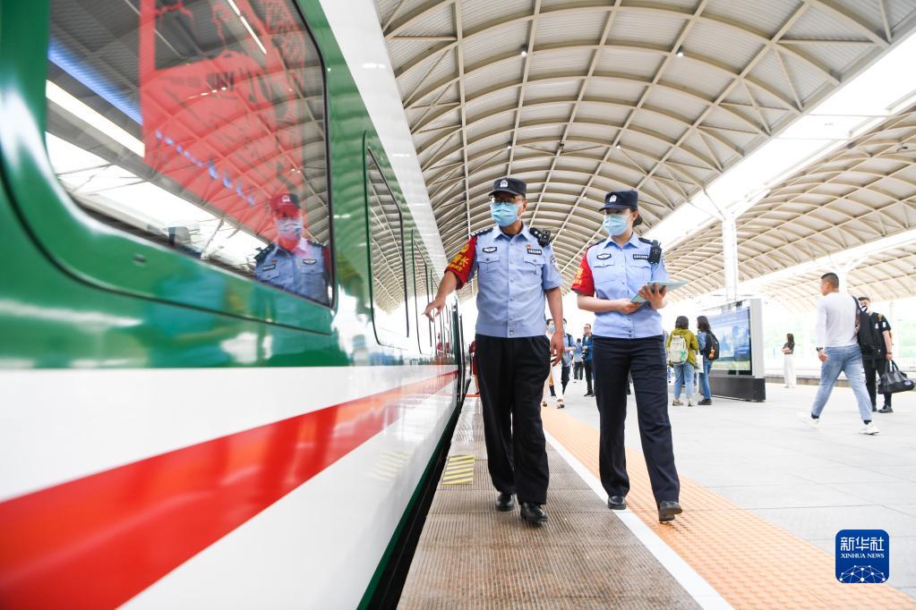 7月1日,C891次西寧至格爾木動車組列車值乘民警在做出發前的檢查。