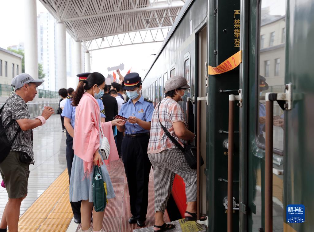 6月30日,鐵路上??瓦\段列車員顧書聞在車門口驗票。