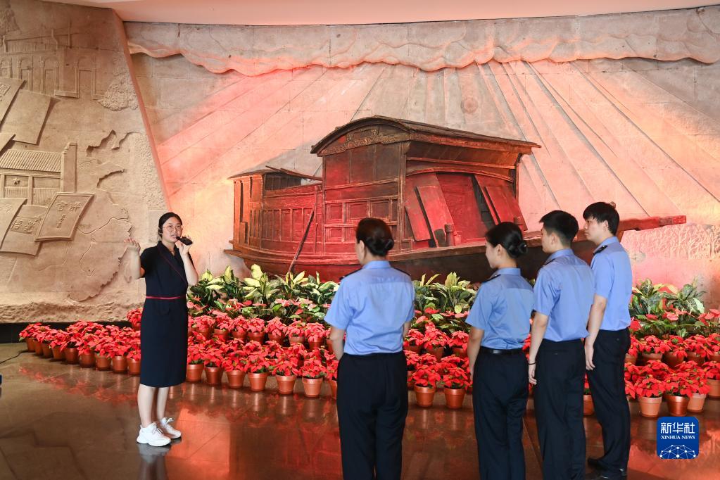 6月30日,南湖革命紀念館講解員(左)為紅色旅游列車乘務組黨員代表介紹歷史陳列。