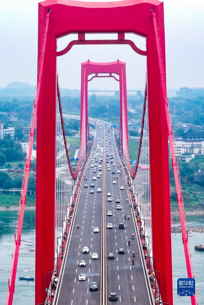當日,四川瀘州長江二橋建成通車。該橋長1016米、主跨576米,是瀘州首座雙層公軌兩用懸索橋。新華社發(劉學懿攝)