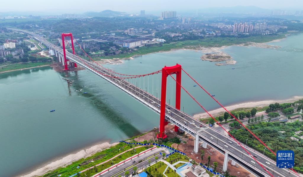 當日,四川瀘州長江二橋建成通車。該橋長1016米、主跨576米,是瀘州首座雙層公軌兩用懸索橋。新華社發(劉學懿攝)