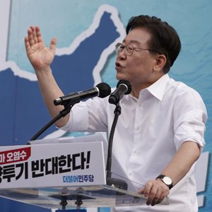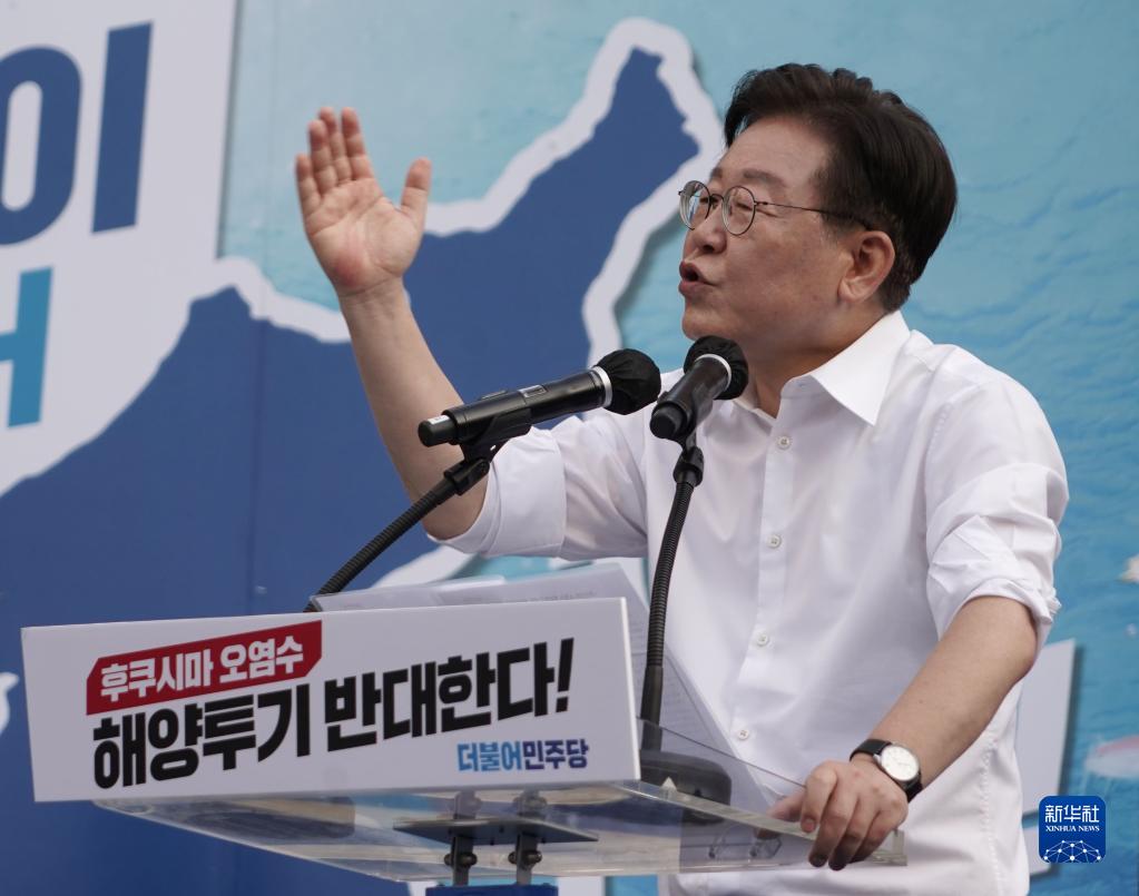 7月1日,韓國最大在野黨共同民主黨黨首李在明在首爾舉行的“譴責福島核污染水海洋排放泛國民大會”上發言。