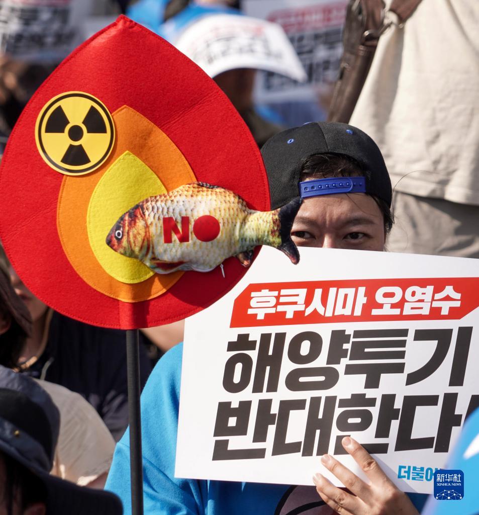 7月1日,民眾手持“反對向海洋排放福島核污染水”字樣的標語在韓國首爾參加集會。新華社發(李相浩攝)