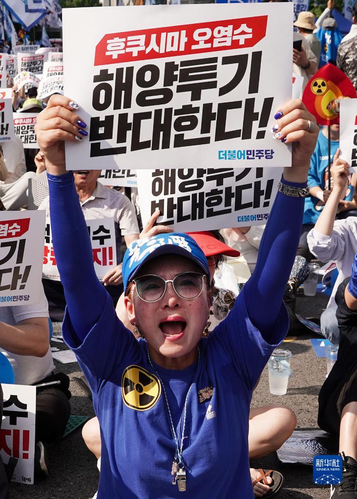 7月1日,民眾手持“反對向海洋排放福島核污染水”字樣的標語在韓國首爾參加集會。新華社發(李相浩攝)
