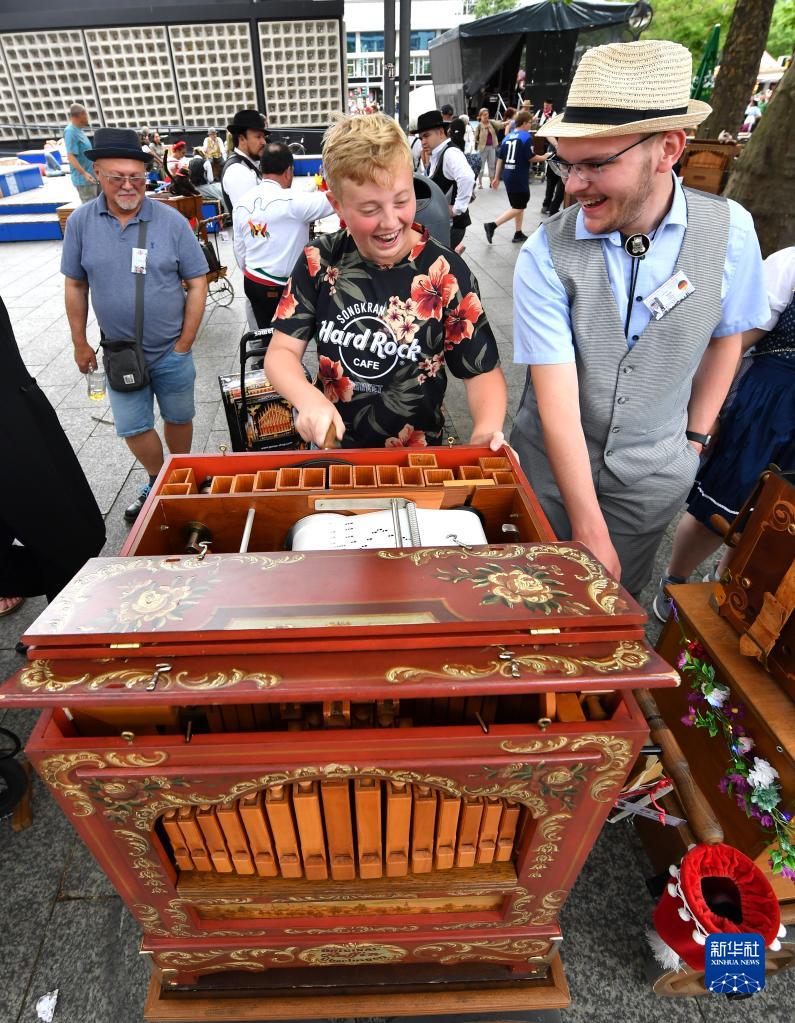 7月1日,觀眾(中)在德國柏林國際手搖風琴藝術節上體驗演奏手搖風琴。新華社記者 任鵬飛 攝