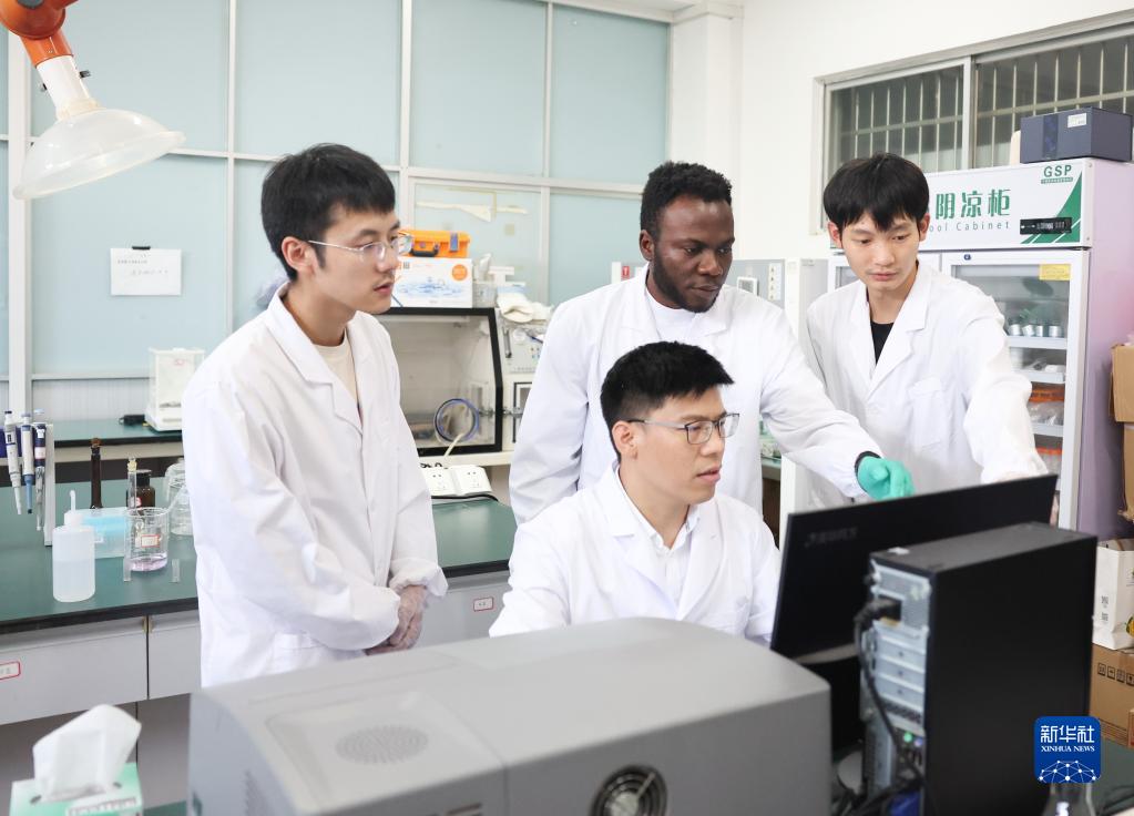 6月26日,在湖南農業大學環境微生物學實驗室,尼克(右二)在導師周耀渝(左二)的指導下和同學們一起查看實驗結果。