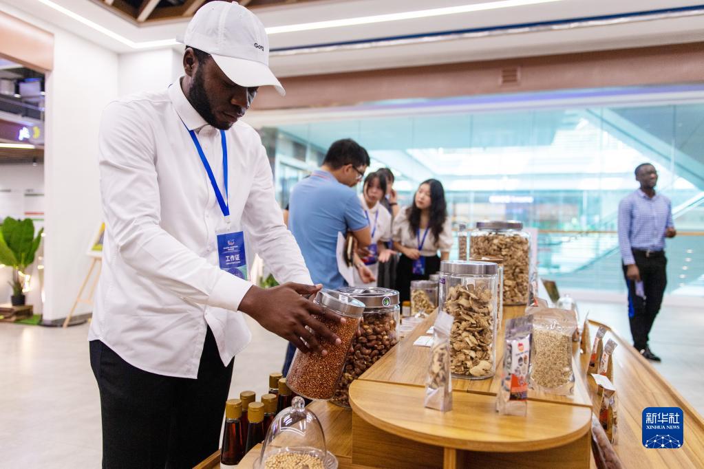 7月1日,在中非經貿合作促進創新示范園(湖南高橋大市場)尼日利亞展館,尼克在整理家鄉特產。