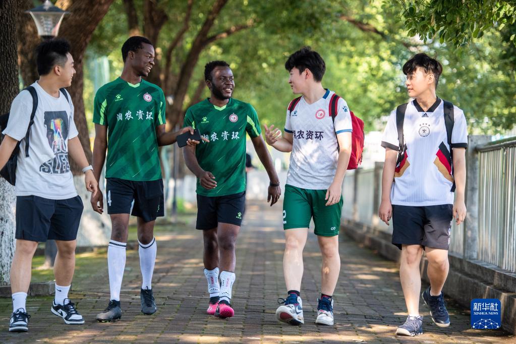 6月26日,在湖南農業大學校園,尼克(中)準備和同學們踢足球。