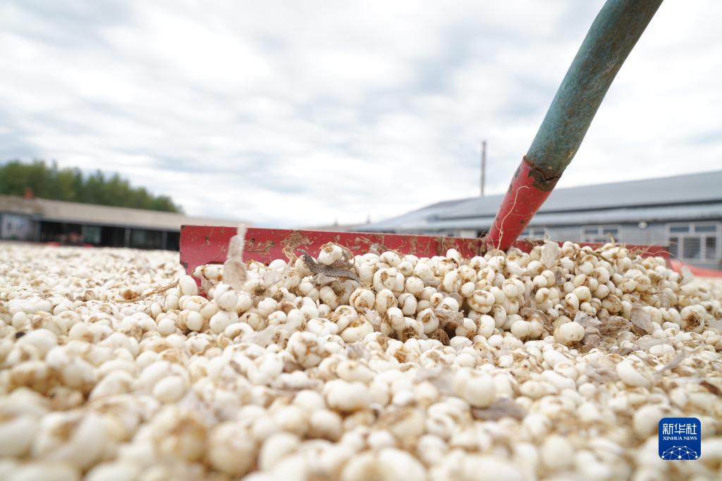 在滿江紅村的鐵力市裕盛平貝種植農民專業合作社,工人在晾曬平貝(7月1日攝)。