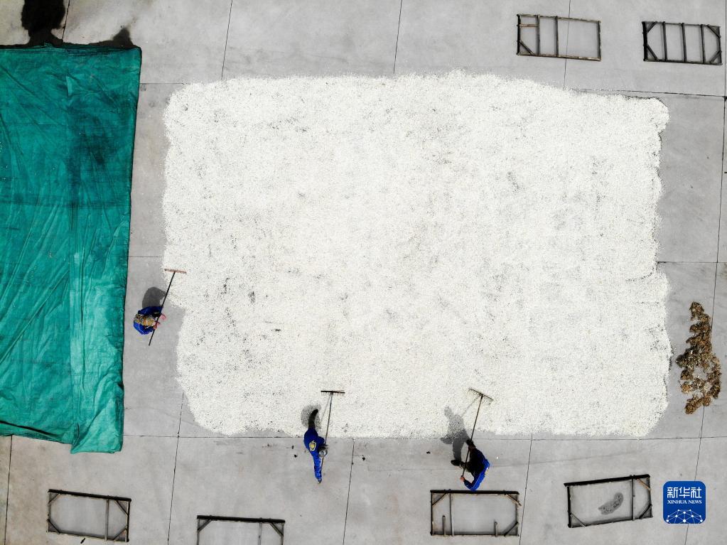7月1日,在滿江紅村的鐵力市裕盛平貝種植農民專業合作社,工人在晾曬平貝(無人機照片)。