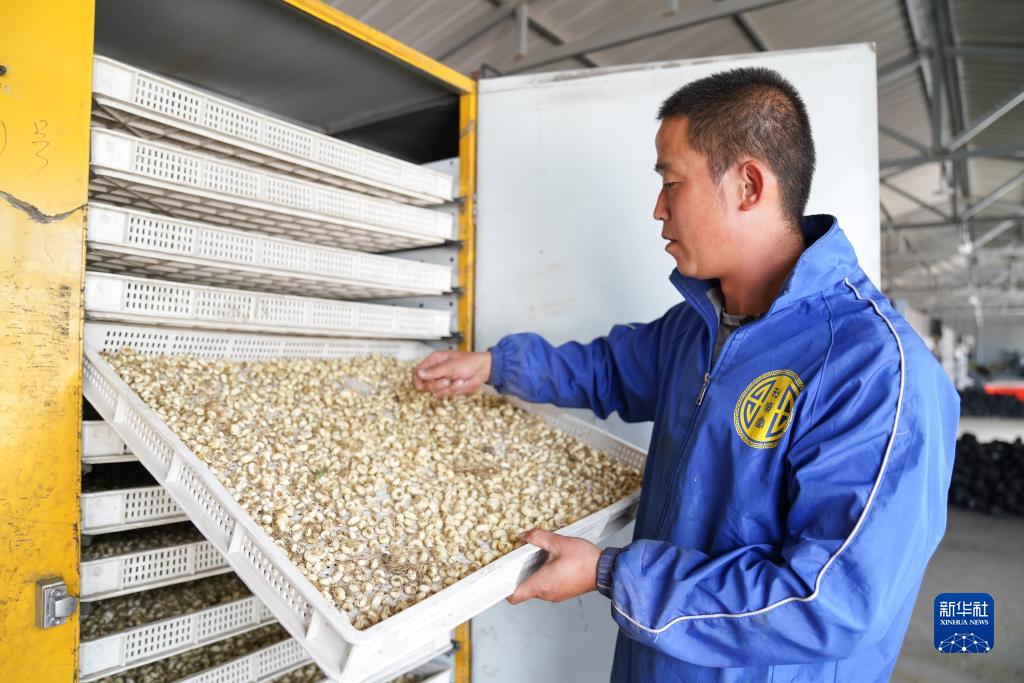 在滿江紅村的鐵力市裕盛平貝種植農民專業合作社,工人在烘干平貝(7月1日攝)。