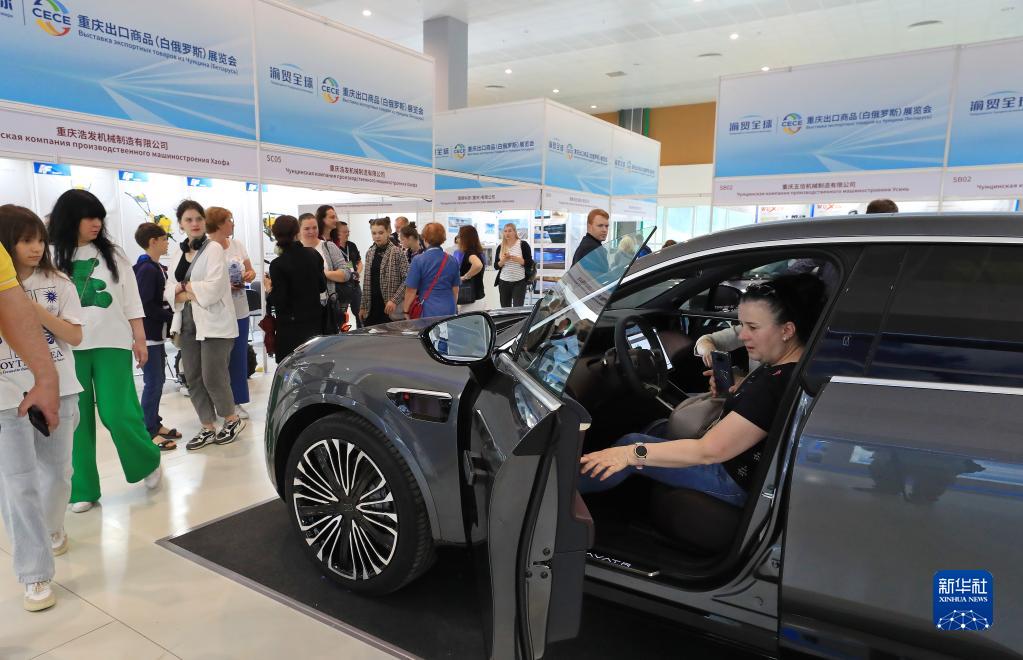 7月1日,在白俄羅斯明斯克中白工業園,參觀者在展覽會上體驗中國生產的電動汽車。