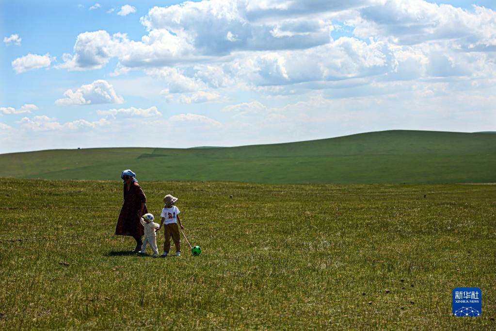 7月1日,在呼倫貝爾市陳巴爾虎旗,一位牧民帶著孩子們行走在草原上。