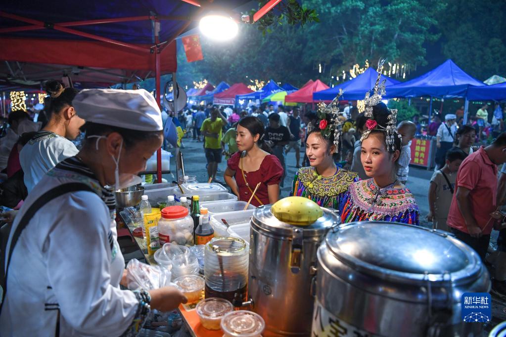 7月1日,游客在貴州“村超”足球賽場附近設置的免費攤位購買地方特色小吃。