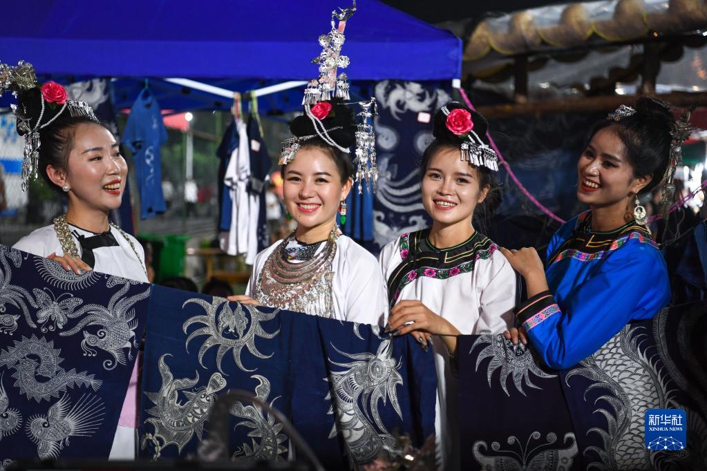 6月30日,村民在貴州“村超”足球賽場旁的文創攤位展示民族服飾。