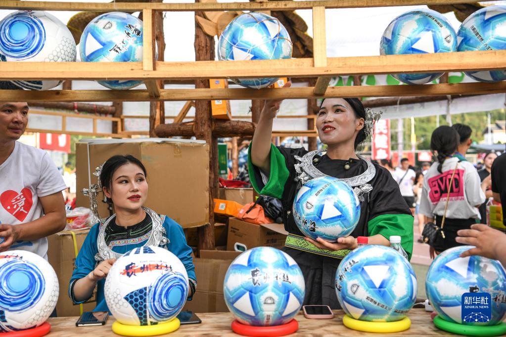 7月1日,村民在貴州“村超”足球賽場旁的文創攤位整理足球。